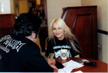 Doro has just released a brand new, two disc DVD, entitled "Fur Immer", which, in Doro's own words, contains "Everything a true, die hard metal fan would like to see". Included on "Fur Immer" are most of the video clips she did for Warlock and as a solo artist but unfortunately a few are missing because she was unable to obtain the rights to them. She was fearful, in fact, that she would not be able to get the right to the "All We Are" video (one of the most popular Warlock songs) but they were able to in the end. The DVD also contains many live performances and interviews from over the years, and a few surprises. On thing which was unfortunately excluded was Warlock's performance on "ECT", a British heavy metal show from the 80s. Seeing this performance was how I discovered Warlock, and Doro gave me the inside story about it. A number of mishaps occurred that day, including a collapsing stage and some pyro that went off unexpectedly. Sounds like something that would happen on "Spinal Tap!" Perhaps this performance could be included on the next Doro DVD? Going further into her past Doro commented on an old interview she had done early in her career; "I said 'Heavy metal is really growing in Dusseldorf'...that was all I could think of to say! In my mind it was just my little hometown! I never thought of going to another country or city! I never believed I would ever go to America or Russia or any other place. It was so funny!" I then asked her about the inside story of a couple of classic Warlock videos, "Fight For Rock" and "All We Are". Beginning with "Fight For Rock", this is mainly a live performance video, with one little quirk thrown in; at the beginning and the end, the band are portrayed as young kinds, no older than twelve! I asked Doro for the scoop behind this idea. The video was filmed in Vienna, Austria. When the kids showed up for their audition, they were all dressed up, nice and neat, in their school uniforms. This was NOT what Doro and the band wanted; they wanted the kids to have a more "rock and roll" look, so she and her bandmates set about giving the young 'uns a makeover and "went to great lengths to get them dirty!" Some child labor laws must have been broken along the way, as they filmed late into the night! Dealing with the kids' parents was also difficult at times, but everything worked out in the end. The video was successfully completed and everyone enjoyed themselves. Then there was the video for "All We Are", Warlock's most heavily played video. It was filmed in the LA river basin, the same place where "Terminator 2" was filmed. Doro said the set was "like a little city", with the band, film crew, extras, and all those cars! It was a very expensive video at the time, and Doro was pleased with how it turned out, and also that it became such a popular video. I also asked Doro about the artwork on her and Warlock's album covers, especially the rather suggestive painting on the cover of "Triumph And Agony". She described the artist who did it as "A little twisted" (it turns out his whole family is in an asylum!), and she was concerned that he over exaggerated her body a little in that picture. She asked him, "Did you have to do that?", and his reply was "Yes!", and she ended up liking it in the end. I mentioned how some feminist groups has objected to that cover, saying that it was sexist and demeaning to women. Doro scoffed at this, saying "There are things more demeaning than that...they search for problems in all the wrong places!" She also mentioned that the "All We Are" video was featured in a movie about Satanism, and how she also found this to be ridiculous. This led to a rather interesting discussion comparing the US and Europe in terms of sexuality. In Europe, she said, people are much more laid back there and sexually tolerant. When Americans visit Europe they are often surprised at how "loose" things are there. Photos of naked women in magazines and mixed saunas are commonplace. Doro then told me a story about her drummer Johnny Dee and his first experience with a mixed sauna. He was nervous at first but after a while he relaxed and enjoyed it. It was a very new experience for him. Doro will be releasing a new album soon, to be titled "Classic Diamonds". She has recorded with a symphony orchestra, and the album will contain some renditions of her classic songs, recorded in a classical environment, as well as some new numbers. Since she recorded with an orchestra (something many metal bands have done lately), we discussed the influence of classical music on heavy metal. We both agreed that both styles of music have a lot in common; "The intensity, the power, the grandness!" Doro also said, "A ballad sounds ten times better with an orchestra than on a little keyboard". Joining her on this album will be Accept/UDO vocalist Udo Dirkenschnieder. They will sing a duet on one of the songs, as they have done once before on UDO's last album, "Man And Machine", where they dueted on the song "Dancing With An Angel". "Classic Diamonds" is to be released on AFM records, whom she recently signed with. Although she is happy with them, she was sad to leave her previous label, SPV, as she had a great relationship with them. This led to a discussion on how it is becoming increasingly difficult for metal bands to make it because of lack of label support and people downloading music off the internet. I mentioned that in the 80s one could pick up a guitar and get a platinum record. That doesn't happen today like it used to. Doro agreed, saying that on Warlock's "Triumph And Agony" tour the label they were on at the time gave them enough financial support to last them for a year. That would never happen today. In fact, Doro took a great risk for her tour with Dio and Yngwie Malmsteen a few years back-she used her life insurance money to pay for it! The tour turned out to be a success, so it was money well spent, but it is an example of how metal bands (older ones in particu